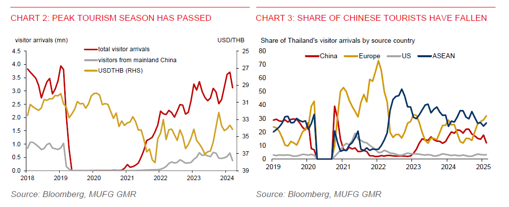 - The earthquake in Thailand on 28 March will weigh heavily on the tourism industry, at a time when safety concerns over the kidnapping of a Chinese actor have already affected visitor arrivals from China. Indeed, Chinese tourists have fallen to 0.37mn in February, which was just 55% of what it was a year ago and about 35% of the pre-Covid level in February 2019. Before Covid, Chinese tourists accounted for about 27.5% share of total visitor arrivals in 2019. But this share has fallen to just 18.3% of the total (on a past 12-month basis) as of February.