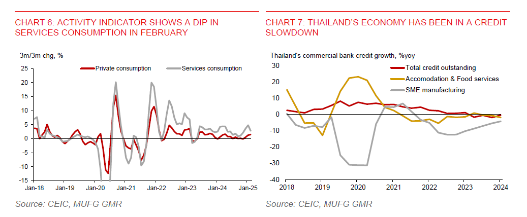 - Latest activity data also shows economic weakness in February. Private consumption slowed to 0.9%mom from 1.3%mom in January, while services consumption notably fell 1.3%mom from a 2% increase in January, in part reflecting a slowdown in tourist arrivals and related spending.