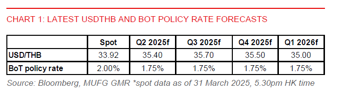 - In terms of our outlook for the Thai baht, we think its resilience may not last over the coming months. For now, rising gold prices and weak oil prices have provided support. Also, Thailand’s foreign reserves have risen to $247.1bn, while the current account was 2.4% of GDP in Q4, underpinned by tourism recovery. This brought the current account surplus to 2.1% of GDP in 2024, up from 1.5% of GDP surplus in 2023. That said, we forecast USDTHB to rise to 35.400-level against the US dollar this quarter, given a weaker outlook for domestic demand, tourist arrivals, and potential negative spillover effects from a weaker Chinese yuan.