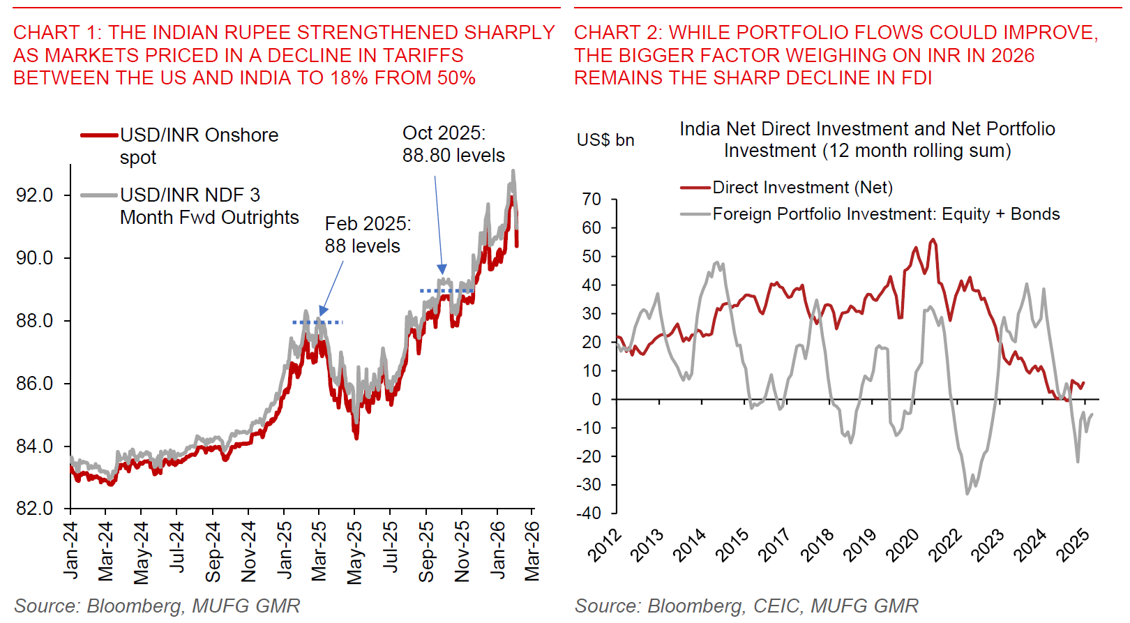 - Overall, we tentatively adjust our forecasts and target USD/INR at 89.50 in 1Q2026 and 93.00 by 4Q2026 (from 91.50 and 94.00 previously), implying some frontloading of portfolio inflows from what we anticipated previously.