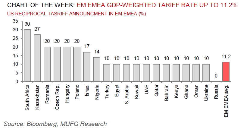 There is a busy event schedule in EM EMEA this week. There will be rates meetings in Israel (MUFG and consensus: on hold at 4.50%) and Romania (MUFG and consensus: on hold at 6.50%). Inflation prints for March will be released in Hungary (8 April), Egypt (10 April), Romania (11 April) and Russia (11 April).