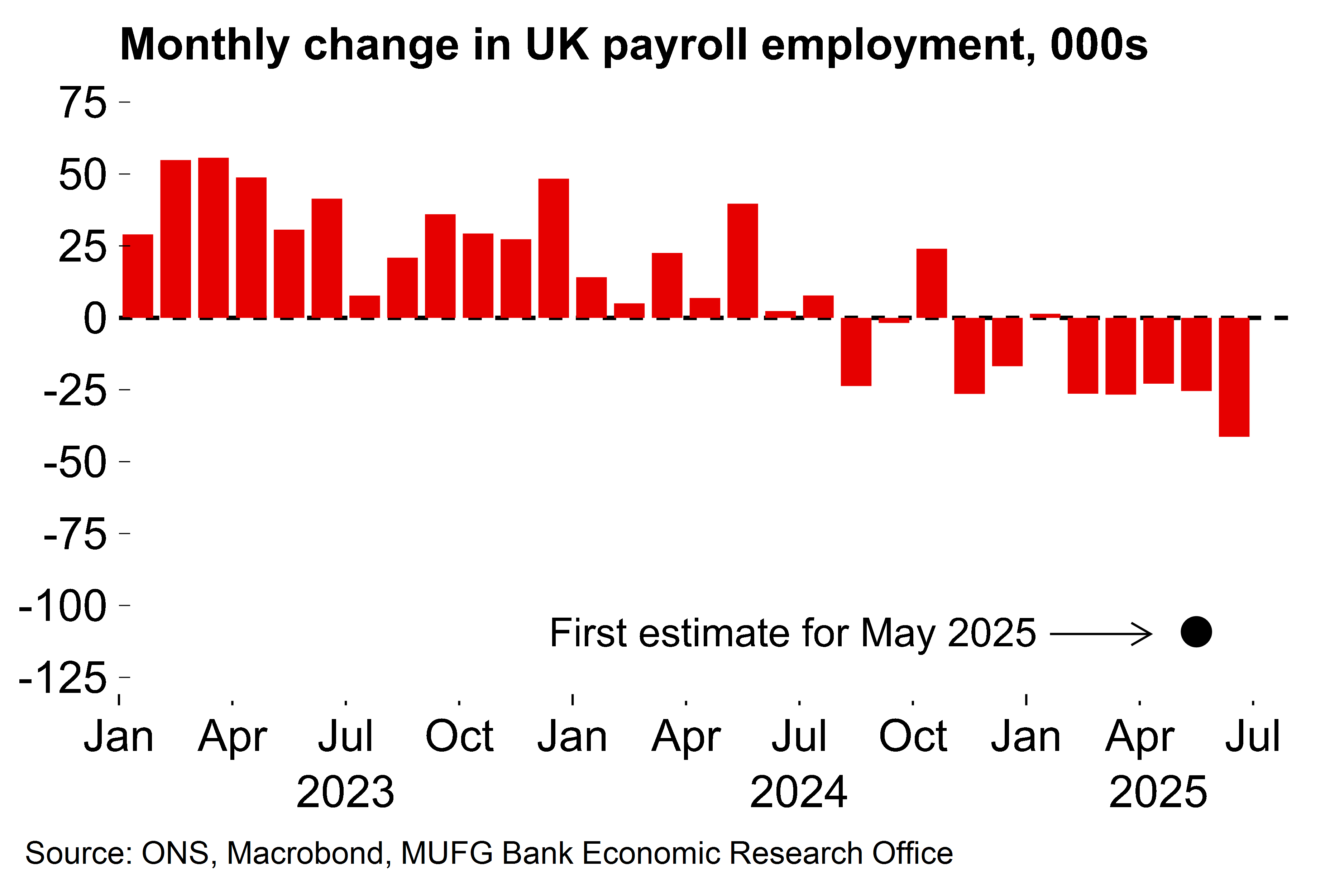 The sharp plunge in the first estimate of payrolls employment for May was largely revised away in the next release (from -109k to -26k). Based on the recent trend for revisions we’d assume that the -41k move in June payrolls will also be revised favourably. Looking at other numbers, e.g. redundancy notifications, there is little evidence of an ‘abrupt loosening’ scenario emerging.