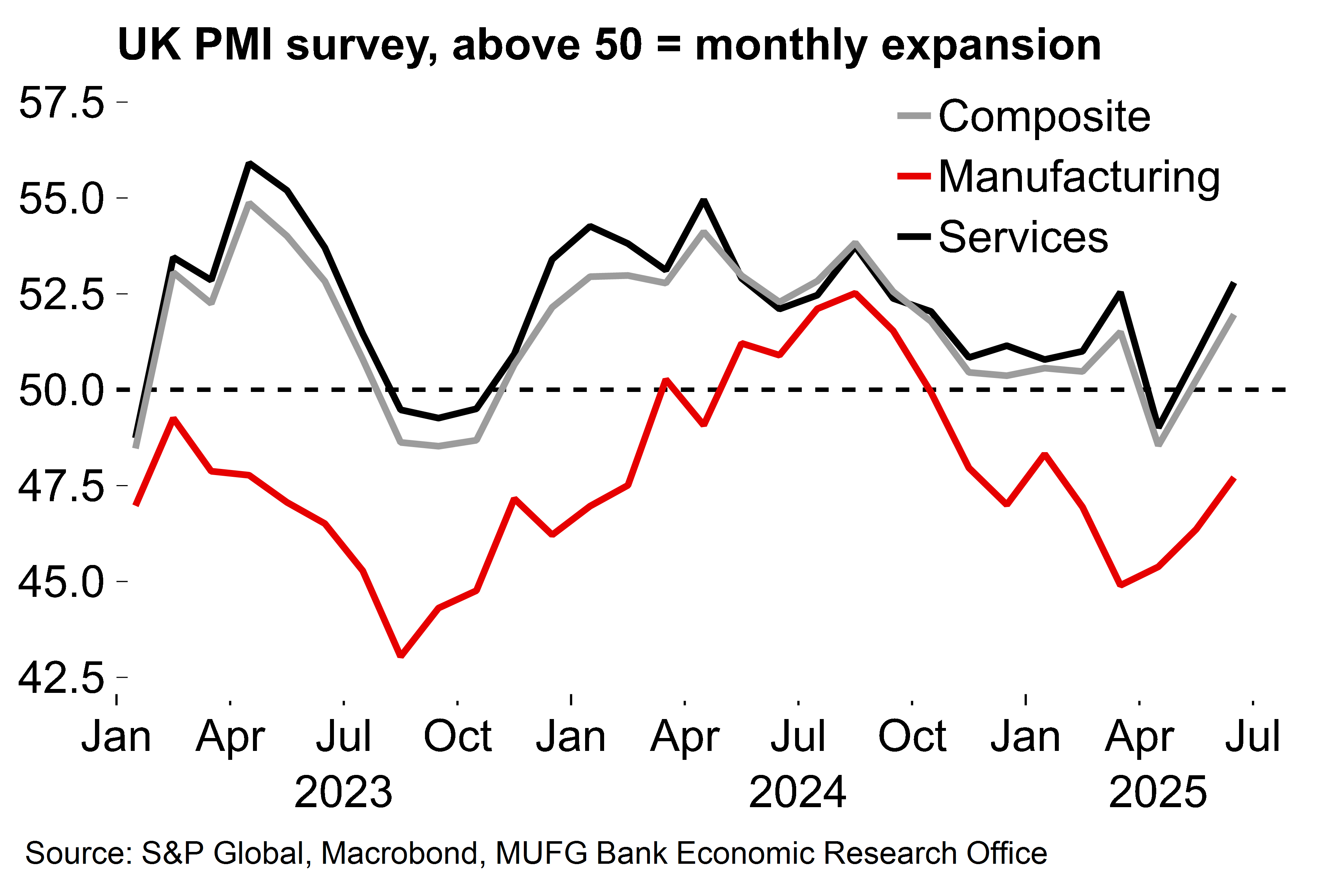 - Still, the mood music around the UK economy has worsened, in part due to fiscal concerns, and weakness in the activity data clearly won’t help with that. Next week’s CPI and labour market data could provide a further test for sentiment if inflation looks sticky and recent signals of a jobs market slowdown are strengthened. In terms of policy we still see the BoE sticking with its established pace of easing, with another move in August, but judge that risks are tilted towards faster cuts.