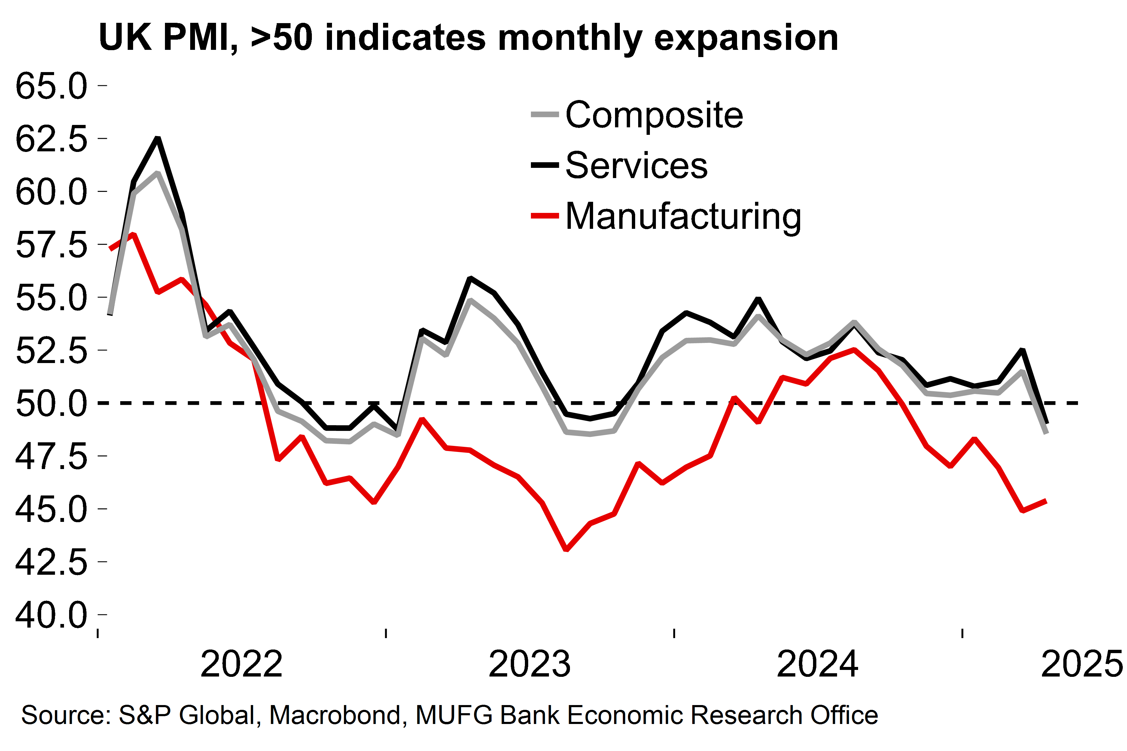 We remain relatively optimistic about the UK outlook but nevertheless expect that strong Q1 growth will be a short-lived spurt. The temporary boost from US frontloading will reverse in Q2. US tariffs plus related uncertainty around global growth prospects will clearly provide an additional headwind, with signs of that already seen in the weak April PMIs.