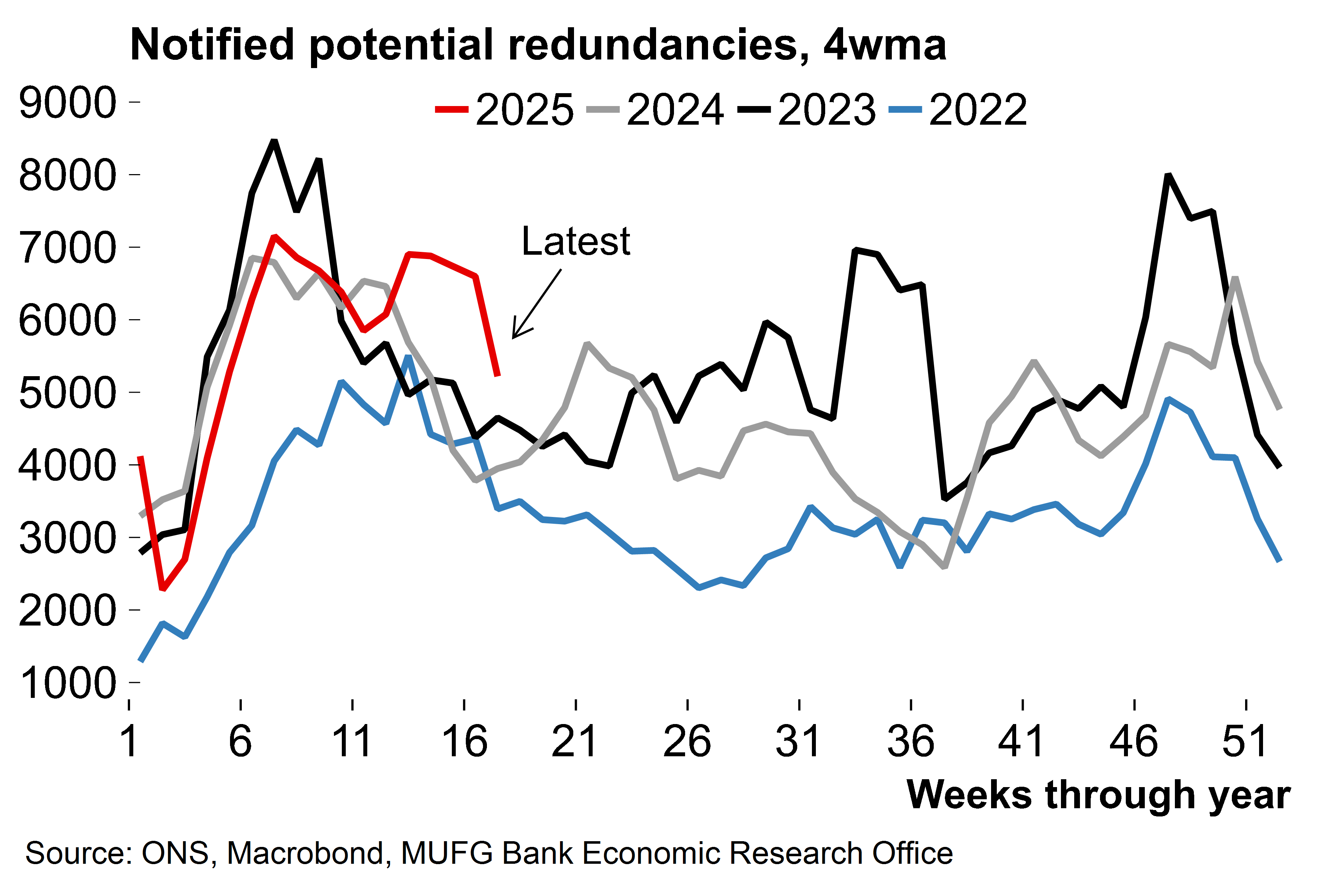 But the near-term outlook looks better. Q2 GDP growth is set to be supported by some momentum in the March figure (+0.2% M/M) and signs of resilient consumer spending despite the slowing labour market. BRC data showed retail sales growth of 7.0% Y/Y in April, which looks healthy even when accounting for the late Easter this year.