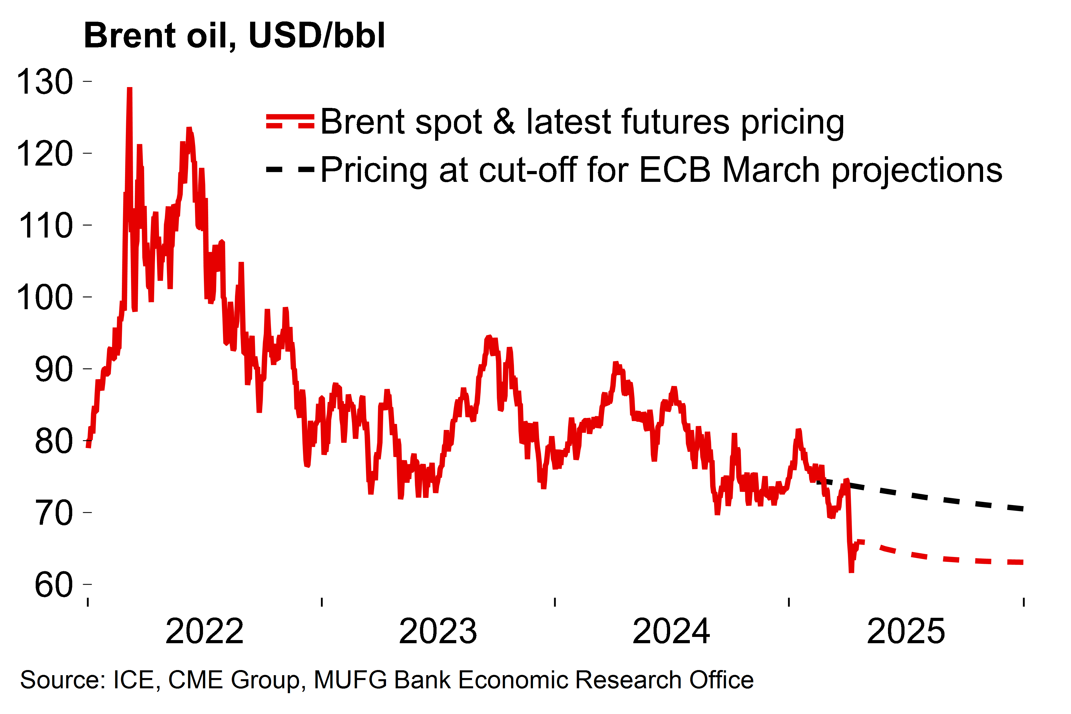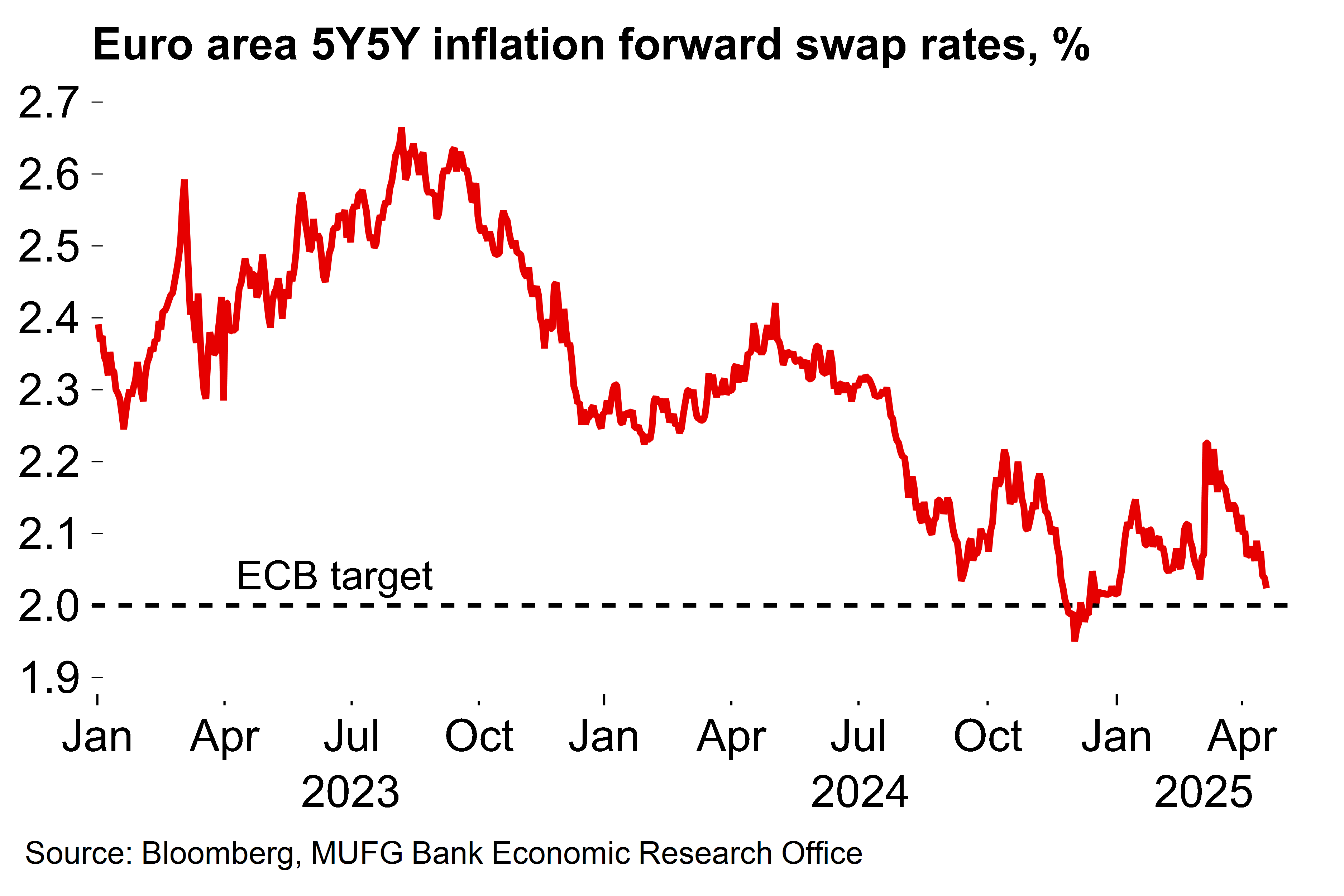 The news flow since the last ECB meeting (when the German fiscal shift had already been announced) has almost uniformly pointed to increased disinflationary pressures. As well as the negative demand shock of the US tariff announcement, March inflation numbers came in weaker than expected, the euro has strengthened markedly and energy futures have shifted lower. Meanwhile, the EU is giving every indication that it wants to avoid the sort of tit-for-tat tariff escalation scenario seen between the US and China. That development also points to trade diversion effects weighing on euro area inflation.