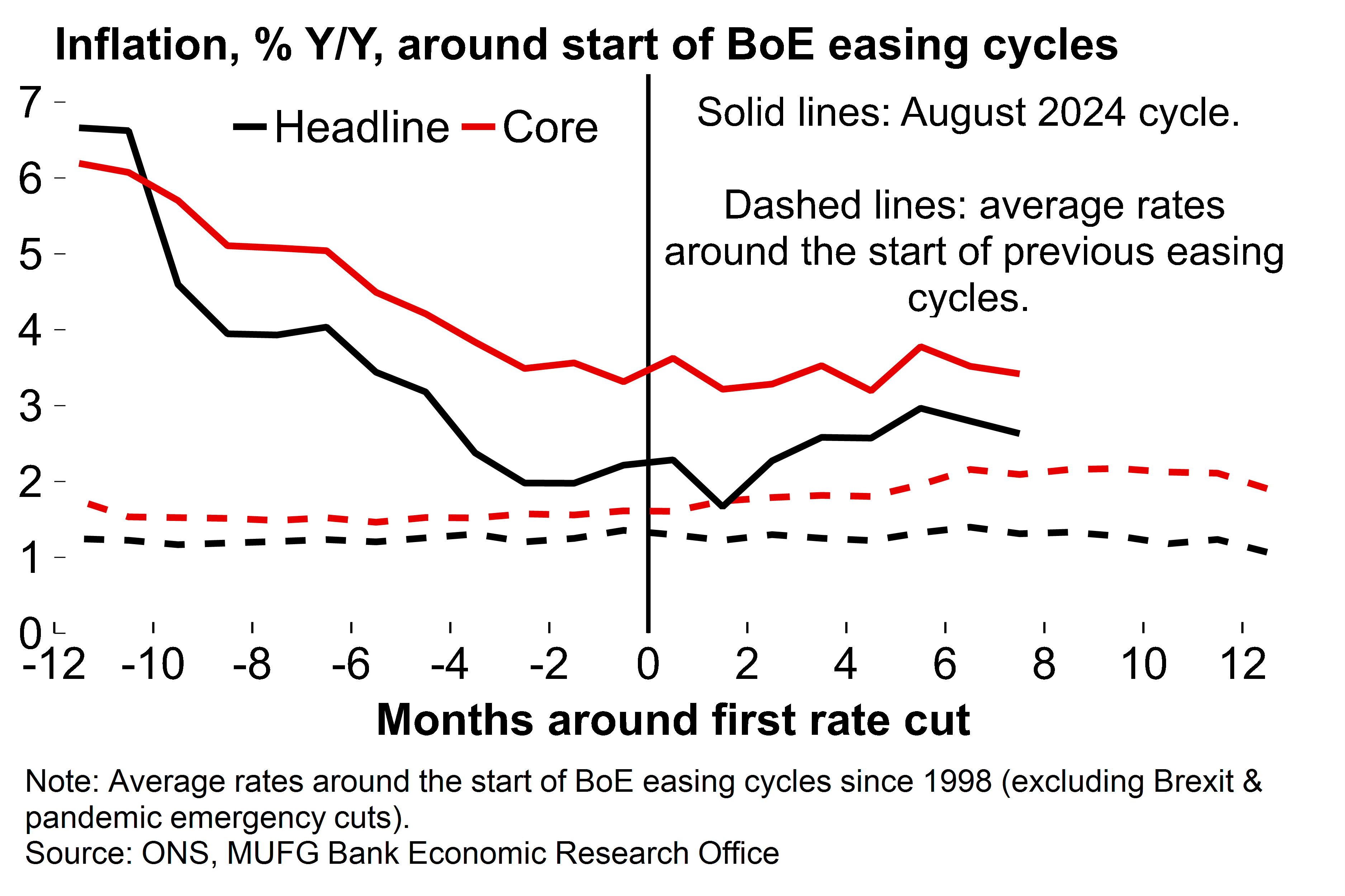 For now, we think that policymakers will be content to indicate that more cuts are coming (e.g. through forecasts showing that unchanged rates would leave inflation undershooting the target), but will stop short of giving any clear indication of a shift to a faster pace of cuts.