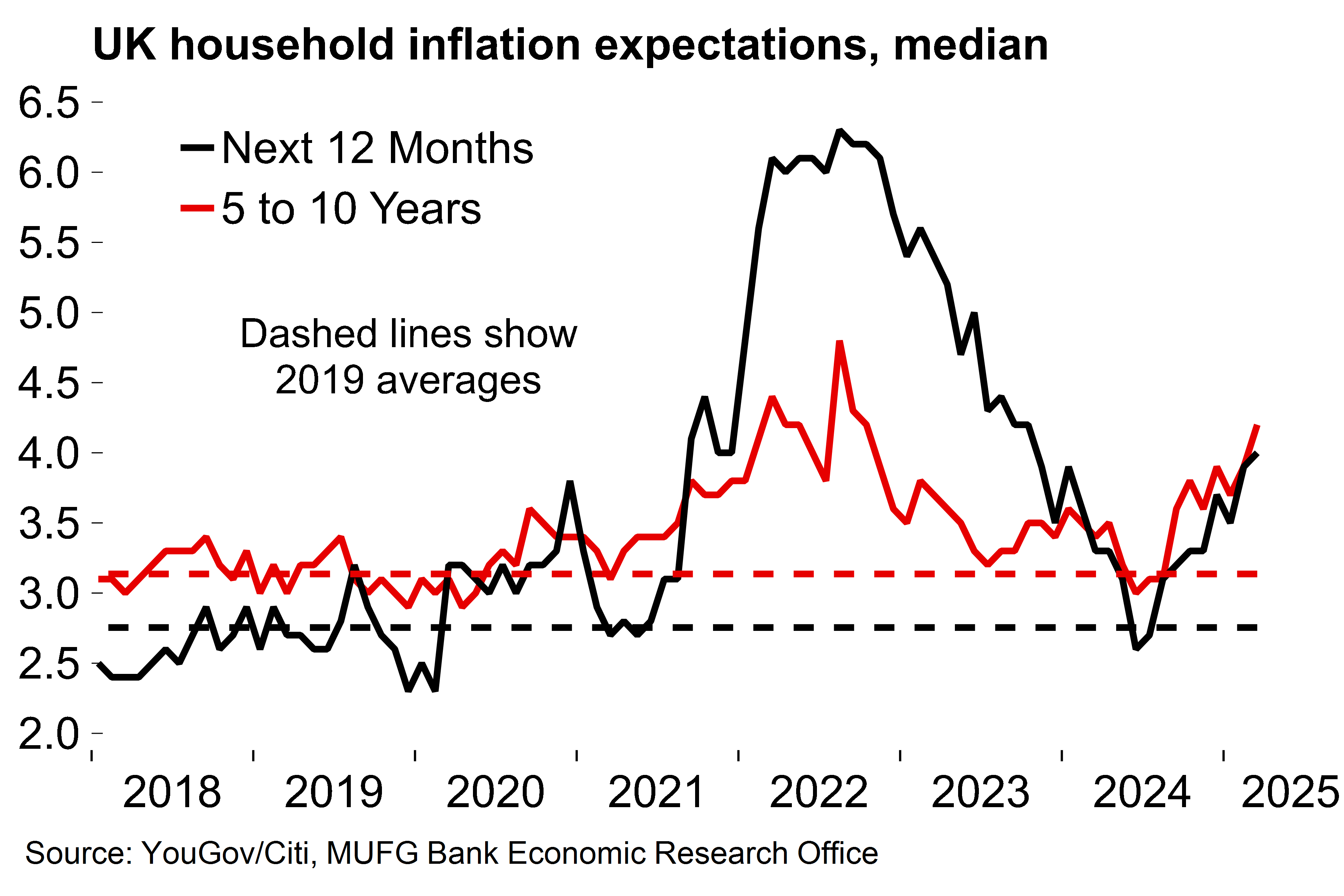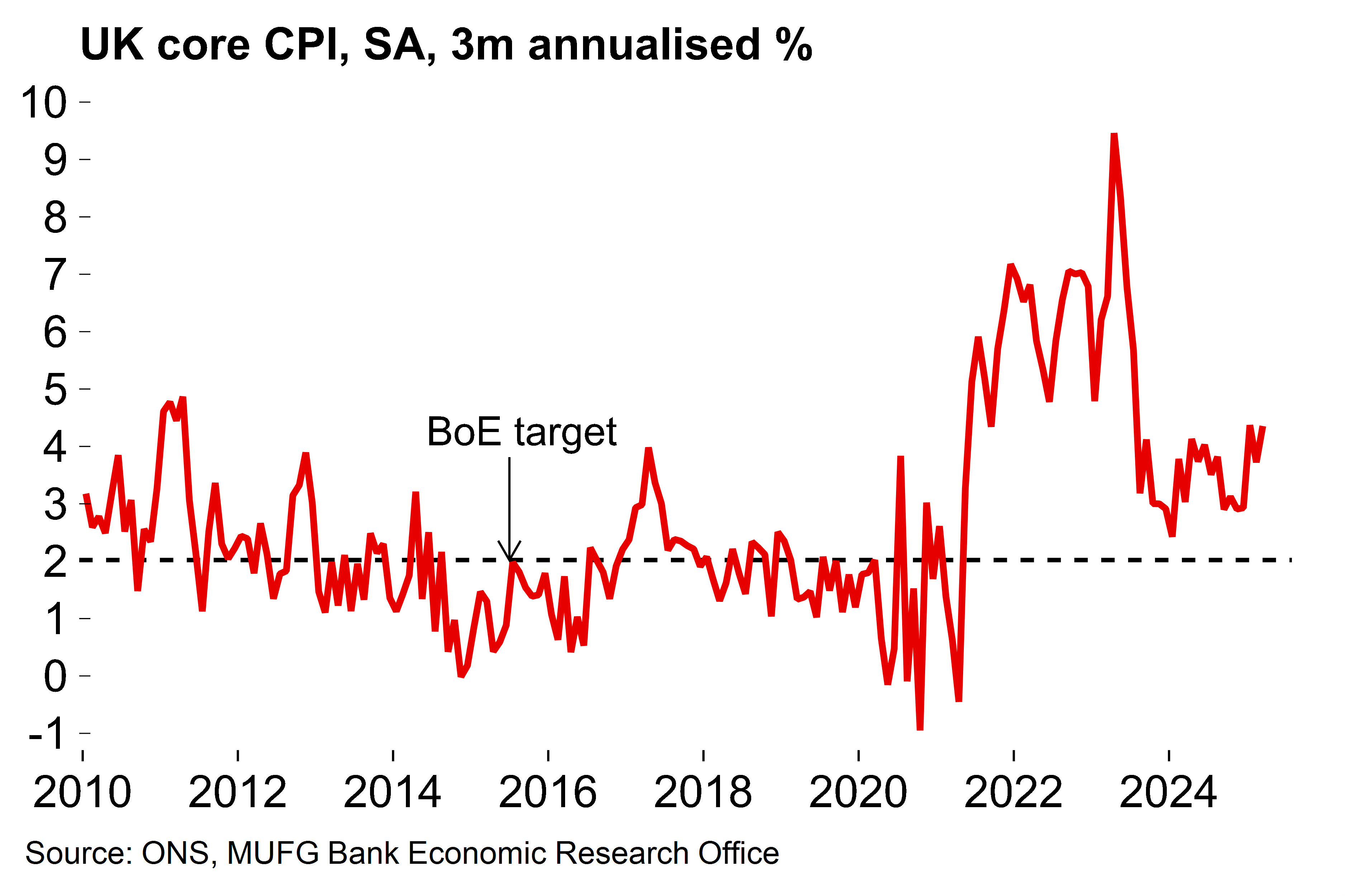 In terms of growth, it’s also clear now that the UK economy has started the year on a good footing. The BoE was expecting 0.1% Q/Q growth for Q1 in February (and 0.25% in March). After strong retail sales figures we are now tracking a figure of 0.6%. That is above potential and will support the BoE’s new annual average forecast for 2025. Remember, the UK government pared back its spending plans only slightly at the Spring Statement and new spending will provide a tailwind to activity this year.