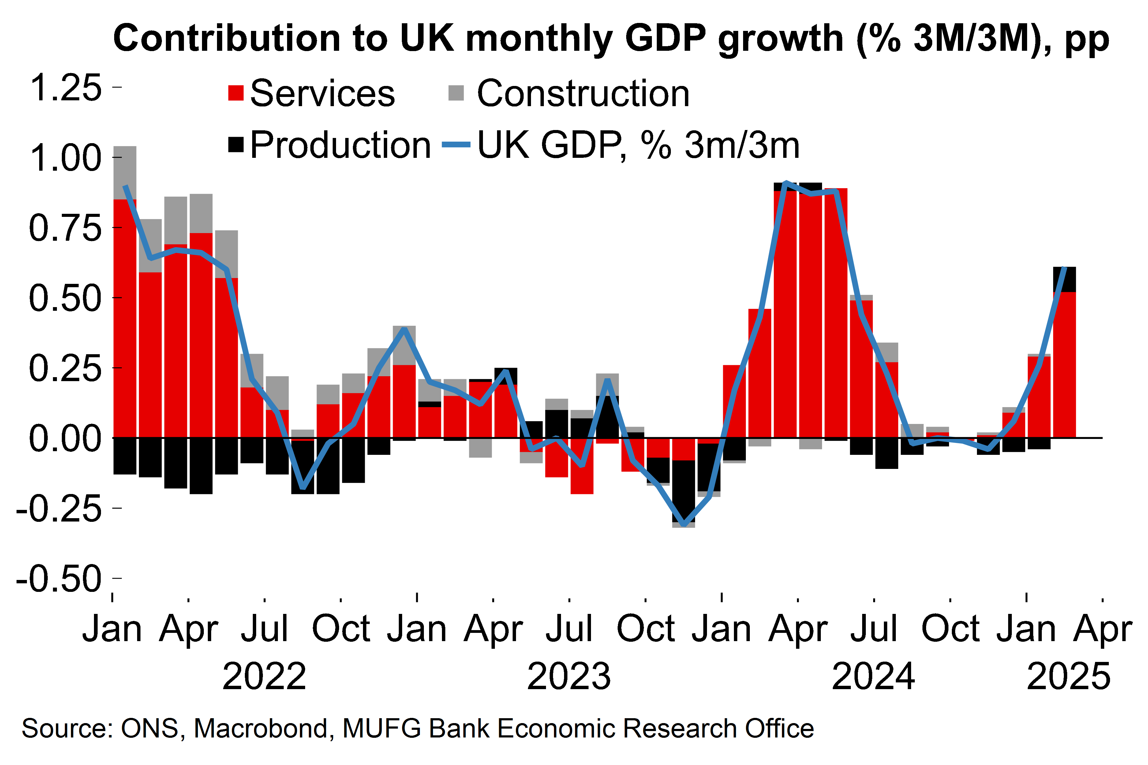 Our view is that policymakers will want to continue to tread fairly carefully for now. Yes, it is clear that the post-‘Liberation Day’ shifts in energy pricing (and to a lesser extent the appreciation in trade-weighted sterling) will prompt a sizeable downgrade to the BoE’s headline inflation projections with a lower peak this year. The UK government also seems content to avoid retaliatory tariff measures, which could have had an almost-immediate upward effect on inflation.