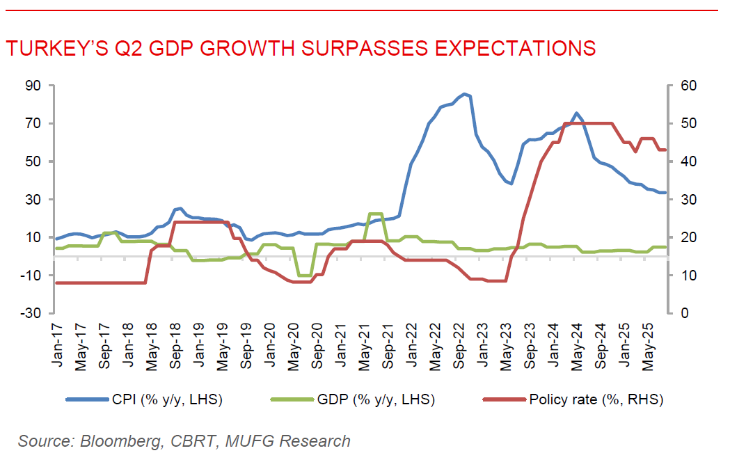 Turkey’s Q2 GDP growth surpasses expectations with 4.8% expansion. Turkey’s economy expanded by 4.8% y/y in Q2 2025, surpassing expectations and highlighting the resilience of certain sectors despite ongoing macroeconomic headwinds. Growth was largely driven by strong performance in construction and information technology, which helped offset weaker agricultural output, while q/q GDP rose by 1.6%, underscoring positive momentum compared to earlier in the year. The expansion reflects a combination of robust domestic demand, selective government support measures, and the impact of earlier investment flows, even as high interest rates and persistent inflation continue to weigh on consumer purchasing power. This better than forecast result supports a cautiously optimistic outlook for the remainder of 2025, though structural vulnerabilities, including reliance on external financing and currency volatility, remain important constraints on Turkey’s medium-term growth trajectory. Going forward, sustaining growth will depend on balancing tighter monetary policy with measures that support investment and exports, while ensuring financial stability in the face of global and domestic uncertainties.