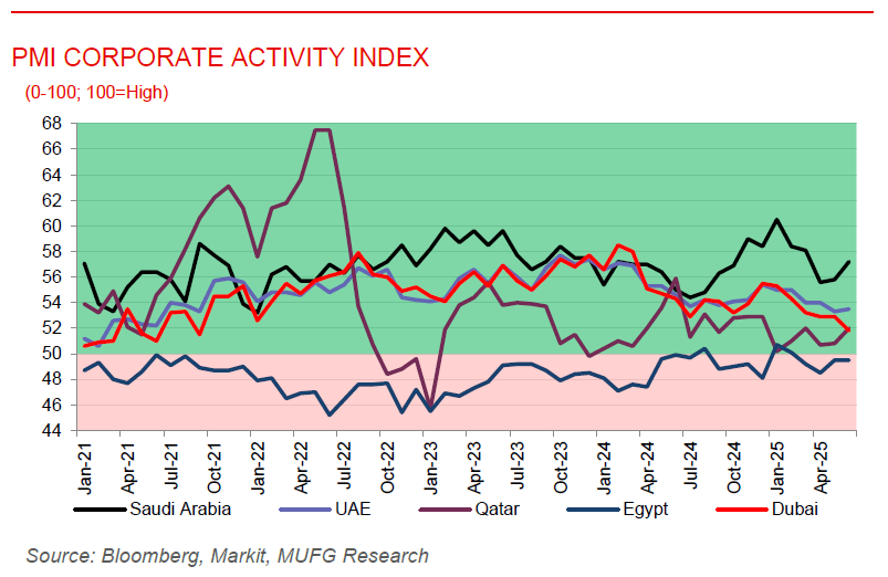 GCC PMI signals strong non-oil sector growth in June. PMI readings across the GCC showed broad resilience in June, with Saudi Arabia, Qatar, and the UAE maintaining expansion in their non-oil sectors. In Saudi Arabia, the PMI rose to 57.2 in June from 55.8 in May, supported by a surge in new orders, robust output, and the fastest pace of job creation in 14 years. Qatar’s PMI climbed to 52.0 from 50.8, reflecting strong wage growth, solid hiring, and rising backlogs despite a slight decline in new business. In the UAE, the headline PMI rose modestly to 53.5 from 53.3, although new orders grew at the slowest pace since September 2021 amid regional tensions. Dubai’s PMI, however, slipped to 51.0 in June from 53.2 in May, the lowest in nearly four years, as competitive pressures and softer tourism weighted on new business. Overall, the data highlights continued expansion in the region’s non-oil private sectors, albeit with some signs of pressure in demand.