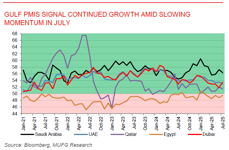 Gulf PMIs signal continued growth amid slowing momentum. In July 2025, PMI readings across key gulf economies pointed to continued non-oil private sector growth, though underlying drivers revealed a mix of resilience and softening demand. In the UAE, the headline PMI dropped to 52.9 from 53.5 in June, the slowest expansion since 2021. This decline was largely due to weakening new order growth and subdued business confidence, influenced in part by regional geopolitical uncertainty. However, Dubai bucked the broader trend with a sharp rebound in its PMI to 53.5 from 51.8, driven by a notable recovery in sales volumes and improved domestic demand. In Qatar, the PMI slipped to 51.4 from 52.0 as the pace of new business growth slowed and firms adopted a more cautious hiring approach despite ongoing expansion. Meanwhile, Saudi Arabia continued to lead the region, though its PMI eased to 56.3 from a three-month high of 57.2. The slight decline reflected slower output growth and a drop in export orders, even as domestic demand remained strong and employment continued to rise at a robust pace. Overall, while all PMIs remained above the 50-point threshold, the regional cooling reflects a moderation in demand and output following strong performance earlier in the year.