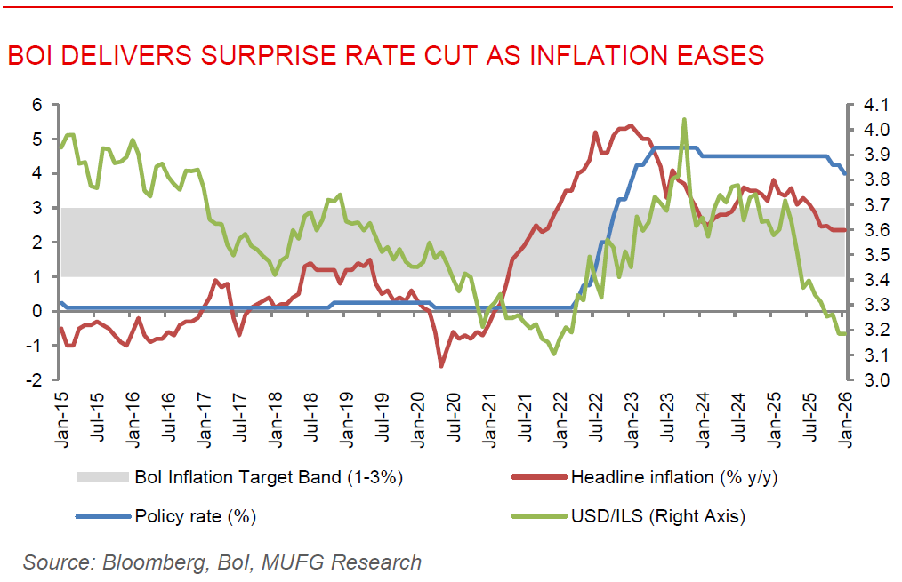 Bank of Israel delivers surprise rate cut as inflation eases. The Bank of Israel (BoI) unexpectedly cut its policy rate by 25bps to 4.0%, citing a more favourable inflation environment, s stronger shekel, easing labour market constraints, and a normalisation of Israel’s risk premium, even as it maintained cautious forward guidance. Governor Amir Yaron stressed that while inflation has moderated, risks of renewed price pressure persist, keeping the future rate path gradual. Updated BoI staff forecasts show a stronger growth outlook, with GDP growth revised up to 2.8% in 2025 and 5.2% in 2026, alongside a sharp downward revision to inflation expectations, now seen at 2.5% in Q4 2025 and 1.7% in Q4 2026. The BoI expects disinflation to be supported by a stronger currency, lower energy prices, and easing global inflation, and now sees the policy rate falling to 3.5% by Q4 2026. While risks remain balanced, ranging from faster demand growth or fiscal uncertainty to geopolitical developments, the BoI noted that a diplomatic breakthrough, including a possible expansion of the Abraham Accords, could improve the outlook, albeit cautious, rate cuts ahead.