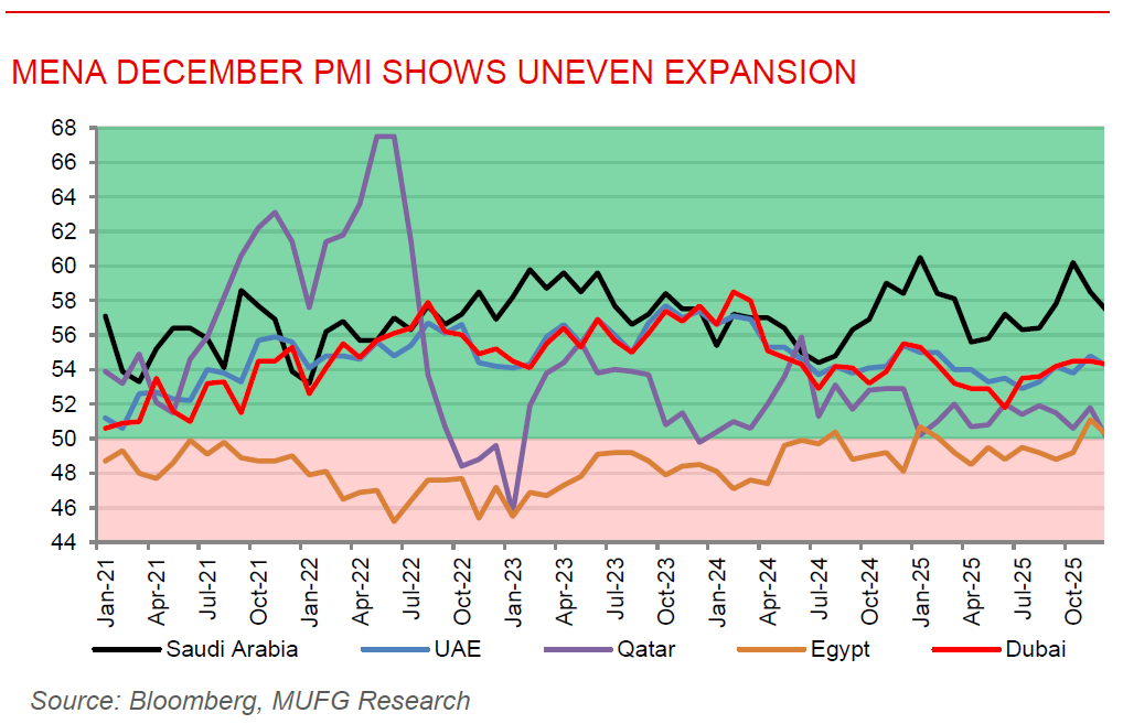 December PMI readings show uneven private sector expansion across MENA. December PMI data pointed to ongoing private sector expansion across key MENA economies, though with softening momentum toward year-end. In the UAE, the non-oil PMI eased to 54.2 in December from 54.8 in November. Within the UAE, Dubai also saw a slight easing from 54.5 to 54.3, reflecting slower growth in new orders while overall activity remained resilient. Egypt recorded a PMI of 50.2, down from 51.1, indicating marginal but sustained expansion in private activity. Meanwhile, Qatar saw a sharper slowdown, with its PMI falling from 51.8 to 50.0, signalling a slowdown in private sector growth. Overall, the December readings suggest that while activity remained resilient, growth momentum softened noticeably heading into 2026.