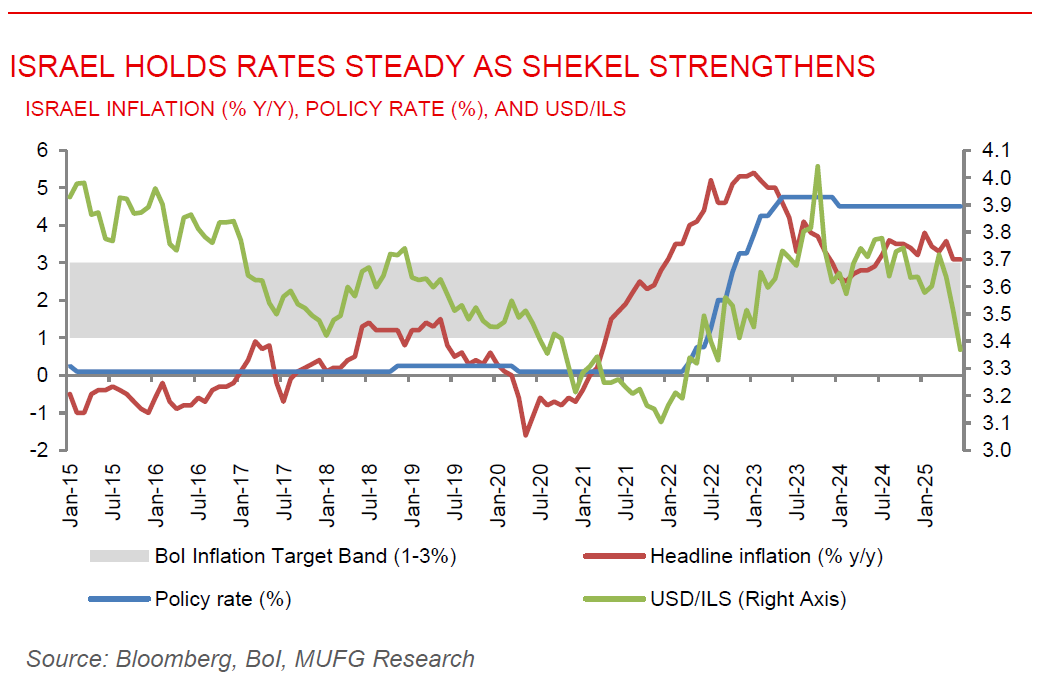 Israel holds rates steady as Shekel strengthens. Bank of Israel (BoI) kept its benchmark interest rate unchanged at 4.5% for the 12th straight meeting, opting to let the shekel’s recent appreciation help cool inflation before considering rate cuts. The currency’s rally, fuelled by last month’s Israel-Iran ceasefire, has erased prior losses tied to domestic unrest and conflict, making the shekel the top performer among major currencies in recent weeks. With inflation still above at 3.1%, the BoI sees currency strength as a disinflationary force, but remains cautious given lingering risks from labour shortages tied to military reserve duties. In June, the BoI sold USD273 million to support the currency, its first direct intervention since October 2023. While markets are now pricing in greater confidence, as reflected in falling credit default swaps, policymakers are balancing economic recovery prospects with inflation risks.