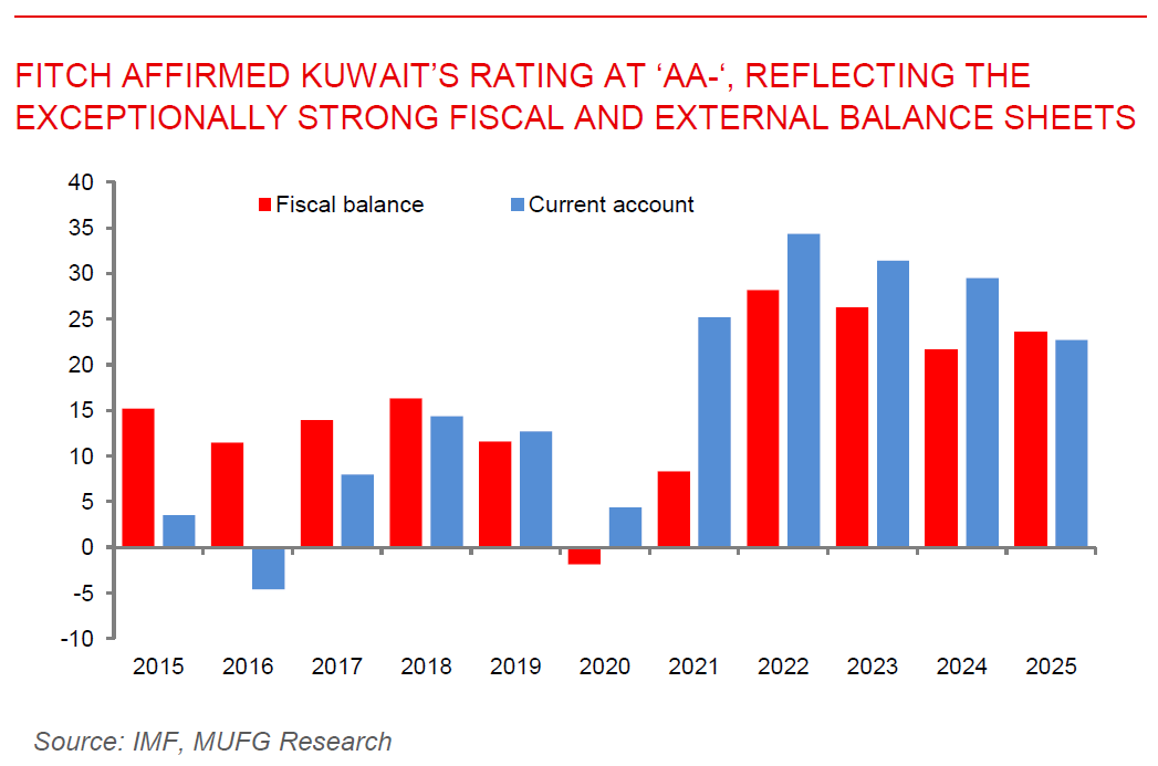 Fitch affirms Kuwait at ‘AA-‘ stable on strong assets. Fitch Ratings has affirmed Kuwait’s credit rating at ‘AA-‘, reflecting the country’s exceptionally strong fiscal and external balance sheets but also structural weaknesses tied to governance, oil dependence, and high welfare spending. Kuwait holds the strongest external balance sheet if any Fitch-rated sovereign, with sovereign net foreign assets forecast to rise to 607% of GDP in 2025, primarily via the Future Generations Fund. Recent reforms include a new financing and liquidity law, allowing debt issuance for the first time since 2017, with plans to raise KWD30bn over 50 years to ease reliance on the General Reserve Fund and support capital markets. While non-oil revenue remains weak at just 8% of non-oil GDP, Kuwait has introduced a 15% minimum tax on multinationals starting 2025 and plans to adopt GCC-wide excise taxes by 2027, though broader measures like VAT are  unlikely soon. While vast sovereign assets provide a strong buffer, Kuwait’s heavy oil reliance leaves it vulnerable to price swings, with fiscal outcomes highly sensitive to shifts in global energy markets.