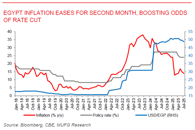 Egypt inflation eases for second month, boosting odds of rate cut. Egypt’s urban inflation slowed for the second consecutive month in July, easing to 13.9% y/y from 14.9% y/y in June, while monthly prices fell 0.5%, helped by a moderation in food prices growth to 3.4% from 6.9% the month before. The slowdown follows last year’s record high of 38% in September 2023 and comes as the country continues to stabilise its economy after securing a USD57bn UAE and IMF bailout. The inflationary cooling could give the Central Bank of Egypt (CBE) scope to resume monetary easing at its August 28 policy meeting, after pausing in July following two earlier cuts. However, underlying price pressures remain, with core inflation, which excludes volatile items like fresh vegetables and fuel, inching up to 11.6% from 11.4%, reflecting persistent demand-driven and structural costs. The Egyptian pound’s recent strengthening to ~48.5 per USD on offshore markets may further ease imported inflation in the import-dependent economy. The CBE expects annual inflation to remain steady for the rest of 2025 before gradually declining through 2026, depending on non-food price trends, global conditions and domestic fiscal measures.