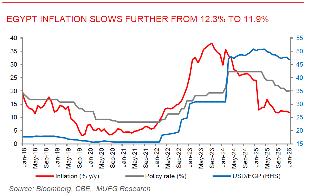 Egypt inflation slows further, strengthening case for additional rate cuts. Egypt’s inflation slowed to 11.9% y/y in January from 12.3% y/y in December, its lowest level since September, reinforcing expectations that the Central Bank of Egypt (CBE) may cut interest rates tomorrow. Core inflation, which excludes volatile items, also eased to 11.2% y/y from 11.8%, while monthly inflation accelerated to 1.2% compared with 0.2% in December. The moderation continues a sharp disinflation trend from the record 38% peak in September 2023, following currency reforms and as international financial support package, although inflation remains above pre-crisis levels and progress toward single digits has been gradual amid subsidy reductions and periodic price adjustments. Food and beverage prices, the largest component of the consumer basket, rose modestly on an annual basis, while seasonal demand linked to the upcoming Ramadan period could add short-term pressures. The benchmark deposit rate currently stands at 20%, leaving Egypt with one of the highest real interest rates among EM, which has supported foreign inflows into local debt but also provides room for further easing. Looking ahead, we expect 100bps cut as policymakers balance supporting growth and investment against risks from exchange rate volatility, global energy prices, and external financing conditions.