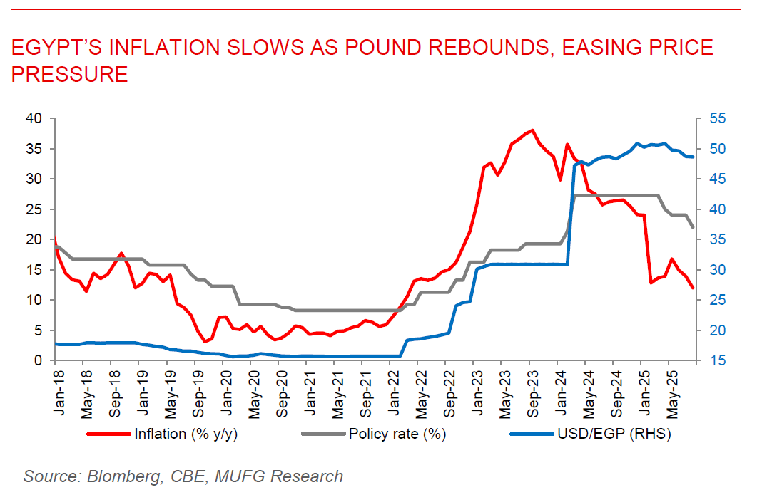 Egypt’s inflation slows as pound rebounds, easing price pressure. Egypt’s annual inflation eased to 12% y/y in August, down from 13.9% y/y in July and marking its lowest level since March 2022, as a strengthening pound helped reduce costs in the import-reliant economy. The currency, which lost nearly 40% in March 2024, has since rebounded to around 48 per dollar, its strongest in 14 months, supported by foreign inflows, tourism, and exports. Monthly prices rose 0.4%, with food inflation slowing to 2.1%, while core inflation cooled to 10.7%. the moderation, less than half the record 38% peak in September 2023, comes as authorities balance subsidy cuts with protecting vulnerable groups, backed by last year’s USD57bn UAE-IMF bailout. With inflation pressures easing and the central bank already cutting rate by 525bps in 2025, further monetary easing remain likely, though potential fuel price hikes could temper moves. Policymakers are targeting 7% inflation ±2% by late 2026, suggesting a continued disinflationary path.