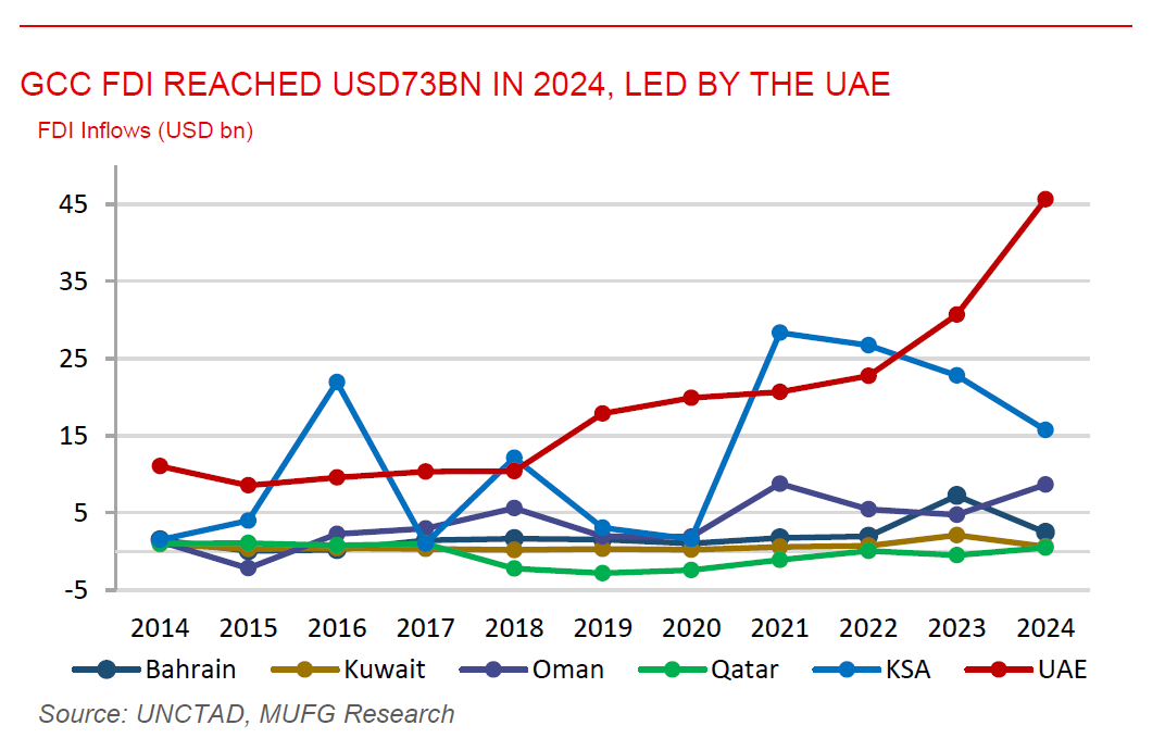 UAE tops Global Greenfield FDI Performance Index for second year. The UAE ranked first worldwide in the 2025 Greenfield FDI Performance Index with a score of 14.3 (out of 105 countries), maintaining its global lead from 2024 by attracting more foreign investment relative to its economic size than any other country. Across the Middle East, five other nations also outperformed their share of global GDP in securing inward greenfield FDI last year. Bahrain emerged as the region’s strongest overperformer with an index score of 5.8, buoyed by strong interest from financial, business, and software service companies positioning it as a hub for regional growth. Bahrain recorded 31 FDI projects in 2024, its highest since 2017. Qatar (4.7), Oman (2.4), Saudi Arabia (2.0), and Jordan (1.8) also exceeded expectations, while Kuwait (0.8) and Israel (0.2) underperformed relative to economic size.