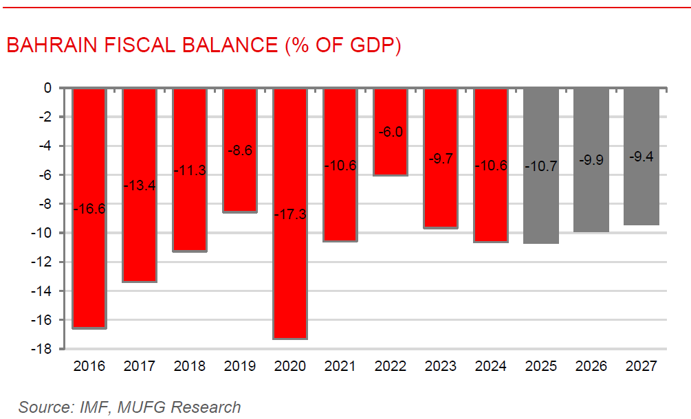 Bahrain’s fiscal reform could stabiles debt, but execution risks remain high. Fitch Rating says Bahrain’s newly announced fiscal package has the potential to deliver meaningful consolidation, up to about 5% of GDP, through measures such as phasing out fuel, electricity and water subsidies, cutting administrative costs by 20%, introducing onshore corporate income tax and other levels, and increasing SOE dividends. Full implementation could help stabilise debt, which under Fitch’s baseline is projected to rise to 141% of GDP by 2027, with deficits near 9% of GDP and interest costs around a third of revenue. Fitch estimates Bahrain needs a primary surplus of 1% of GDP to stabilise debt, implying 4% of GDP improvement from the 2025 primary deficit. However, the agency cautions that Bahrain’s track record on fiscal delivery is weak, political constraints may dilute or delay reforms, and the debt path remains highly sensitive to oil prices, which account for over half of fiscal revenue.