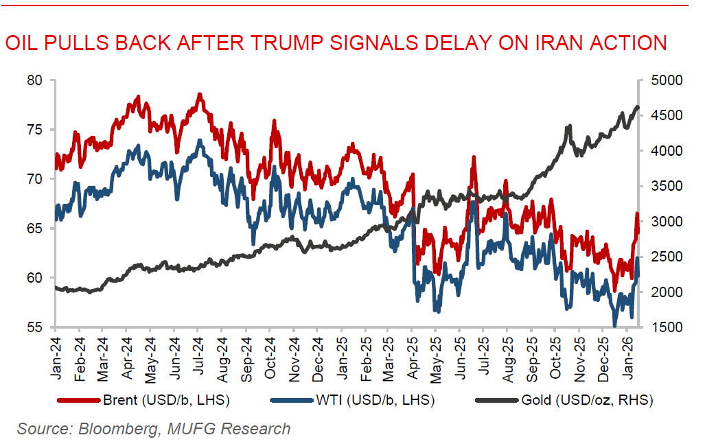 Oil pulls back after Trump signals delay on Iran action. Oil prices fell for the first time in six days after US President Trump indicated he may hold off on military action against Iran, easing some of the recent geopolitical risk premium that had driven crude higher. Brent crude dropped more than 3% to below USD65/b and WTI traded near USD60/b after rising about 11% over the previous week as unrest in Iran and turbulence in Venezuela had lifted prices. Trump said he had been assured Iran would halt killings of protesters, reducing the likelihood of an immediate US strike that could have threatened Iranian oil output and key shipping routes. Despite the pullback, regional tensions remain elevated, including Iran’s temporary closure of airspace and US military repositioning. On the supply side, recent data showed US crude inventories rose significantly, potentially adding downward pressure on prices even as geopolitical risks continue to influence markets.