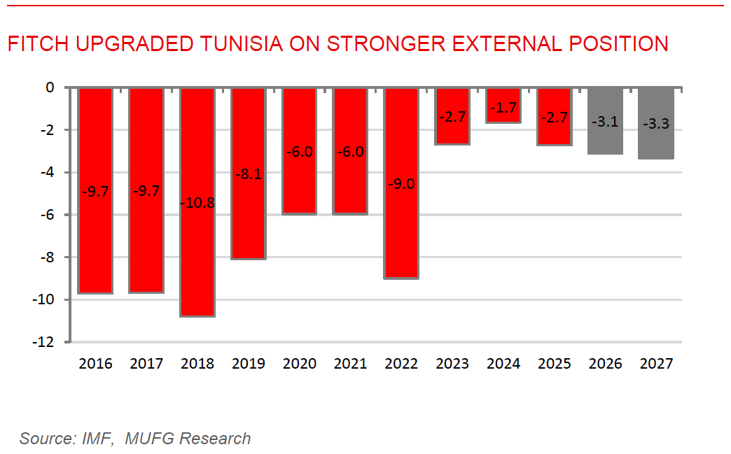 Fitch upgraded Tunisia on stronger external position but warns of fiscal vulnerability. Fitch upgraded Tunisia’s rating from CCC+ to B-, citing improvements in the external position driven by lower current account deficits, resilient foreign direct investments, and steady support from multilateral and bilateral partners that have bolstered reserves and external liquidity. External financing has held up despite the absence of market access since 2021 and no IMF program, with FDI expected to rebound in 2025 and international reserves sufficient to meet declining external debt amortisations. On the fiscal side, financing needs remain high at 16% of GDP in 2025, supported by central bank loans and domestic banks, though this heightens the sovereign-bank nexus. Tunisia’s public finances remain vulnerable to external shocks and rigid expenditure structures, with subsidies, payroll, and interest consuming the bulk of revenues. Fitch noted that without deeper reforms, the country remains exposed to commodity price swings and currency depreciation, leaving long-term fiscal resilience uncertain despite near-term external improvements.