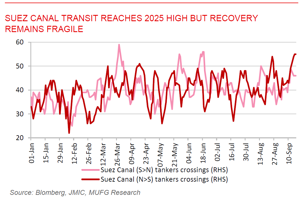 Suez canal transit reaches 2025 high but recovery remains fragile. The number of cargo vessels transiting the Suez Canal rose to 282 in the week ending September 14, the highest weekly level so far in 2025 and up 7.2% from the prior week, according to the Joint Maritime Information Centre (JMIC). While this marks a tentative rebound and signals that some operators are regaining confidence in the canal, traffic is still sharply lower than the 526 vessels recorded in the same week of 2023, reflecting the ongoing reluctance of many shippers to risk Red Sea passage amid persistent security threats. The JMIC highlighted a “critical” intent by the Houthis to target Israel-linked vessels, keeping the overall threat level severe. By contrast, diversions around the Cape of Good Hope climbed further to 714 ships, compared with just 409 a year ago, underscoring the shift toward longer, costlier routes. Other chokepoints saw mixed flows, with Bab al-Mandeb traffic down 7.5% week-on-week to 172 vessels and Strait of Hormuz transits at 930, slightly higher than last year’s 879. The data imply that although the Suez Canal is showing signs of resilience, its recovery remains fragile, and global shipping patterns are still being reshaped by heightened geopolitical and security risks.