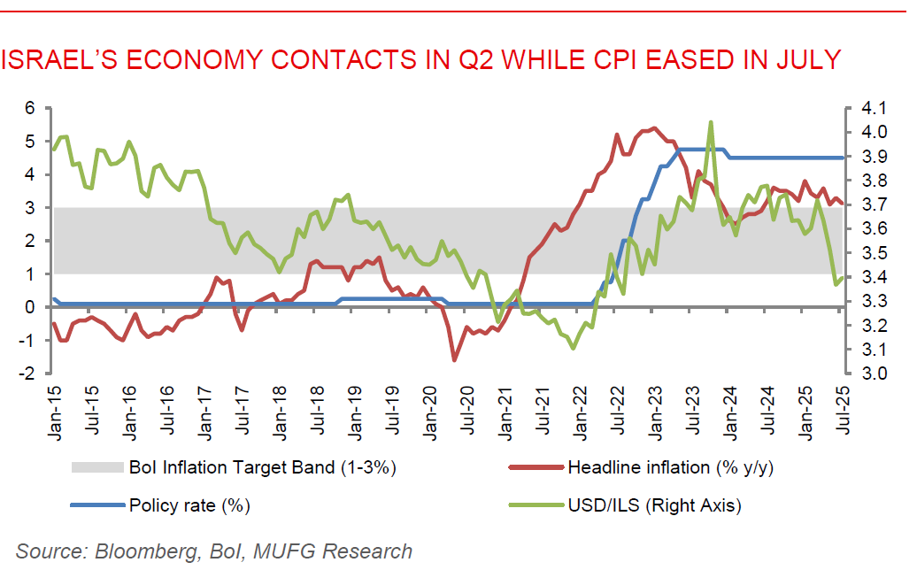 Israel’s economy contracts sharply in Q2 amid Iran conflict. Israel’s CPI fell to 3.1% y/y in July from 3.3% y/y in June, but still reflecting persistent inflationary pressures amid ongoing geopolitical tensions and economic strain. The modest decline suggests some stabilisation, yet elevated costs in housing, foods, transportation continue to weigh on consumers, driven by supply chain disruptions and import price pressures following the recent conflict with Iran. Meanwhile, Israel’s economy contracted by 3.5% in Q2 2025, as the brief but intense 12-day war with Iran in June triggered widespread business shutdowns and sharply curtailed economic activity. The contraction was far worse than expected, with the hardest-hit areas being private consumption and gross fixed capital formation. Business sectors GDP fell 6.2%, and GDP per capita dropped 4.4%, its lowest level in a year. The conflict, sparked by Israel’s surprise attack on Iran targeting its nuclear and military infrastructure, led to Iranian missile retaliation and nationwide shelter-in-place conditions. Despite this setback, the central bank still forecasts 3.3% annual growth, while the finance ministry recently downgraded its estimate to 3.1%. achieving those targets will require a strong rebound in H2, even as the government plans a large scale military operation in Gaza, expected to displace one million Palestinians and demand tens of thousands of reserve troops. The Bank of Israel (BoI) faces a delicate balancing act between addressing inflation and supporting a slowing economy.