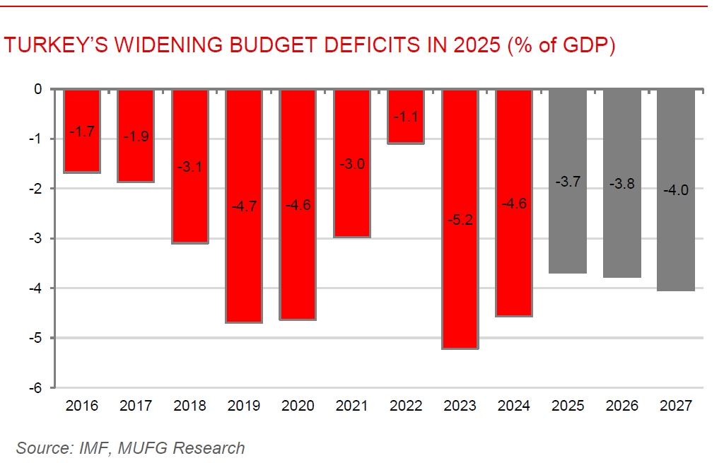 Turkey’s widening budget deficits in 2025. Turkey’s fiscal position continued to deteriorate in 2025, with the central government budget deficit reaching TRY223.2bn (USD5.33bn) in October, up nearly 20% from a year earlier, and the cumulative January-October deficit widening to USD34.3bn. Despite primary surplus, indicating that revenues exceeded non-interest expenditures, however, soaring interest payments of USD43.4bn, up more than 70% y/y, kept the headline deficit elevated. Expenditures grew faster than inflation, driven by personnel costs, current transfers, and investment spending. Under the medium-term program, Turkey expects the full-year deficit to reach USD50.1bn (3.6% of GDP), underscoring lingering fiscal pressures amid high inflation, a weak currency, and substantial debt-servicing costs.