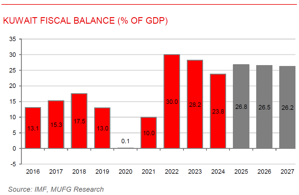Kuwait’s reform drive gains momentum under Vision 2035. According to the IMF, Kuwait is stepping up its transition from an oil-dependent welfare state toward a more dynamic and diversified economy under Vision 2035. Economic activity is recovering, with real GDP expanding by 1.7% y/y in Q2 2025, while inflation has moderated to around 2.4%, reflecting stable macroeconomic conditions. Despite weaker oil revenues, fiscal performance has improved, with the central government deficit narrowing to 2.2% of GDP in FY2024/2025 and the general government posting a sizable surplus at 27.7% supported by sovereign wealth fund investment income, alongside Kuwait’s return to domestic and external bond issuance after nearly a decade. The external position remains strong, with a large current account surplus and ample reserves, although it remains structurally weaker than implied by fundamentals due to heavy reliance on hydrocarbon. Looking ahead, authorities are pursuing gradual fiscal consolidation of about 1% of GDP per year, alongside structural reforms to unify the labour market, improve the business environment, deepen financial markets, and upgrade economic statistics, aiming to support sustainable non-oil growth, preserve financial stability and ensure long-term intergenerational equity.