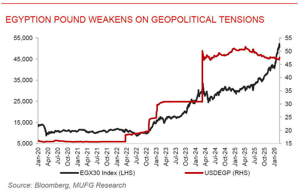 Egyption pound weakens on geopolitical tensions. The Egyptian pound fell to around 47.6 per dollar, marking its biggest intraday drop since June, as foreign selling intensified amid rising regional tensions and fears of a potential US strike on Iran, which also dragged sovereign hard-currency bonds lower and pushed the EGX30 down nearly 3%, reflecting a broader risk-off sentiment across Egyption assets. The pressure was largely externally driven and consistent with previous periods of geopolitical escalation rather than a reflection of domestic instability. In fact, Egypt’s macroeconomic fundamentals have been gradually improving, with record foreign-exchange reserves, moderating inflation from pat highs, tighter monetary policy, and continued IMF support helping stabilise investor confidence and anchor the currency after earlier episodes of sharp devaluation. The flexible exchange-rate regime and stronger foreign inflows from tourism, remittances, and portfolio investments have also contributed to relative FX market stability in recent months. Going forward, the pound is expected to remain sensitive to external shocks, capital flows, and regional risks, but improving macro stability suggest depreciation pressures may be more gradual rather than disorderly, unless geopolitical tensions escalate significantly.