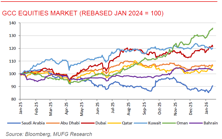Gulf stocks rise as Iran tensions ease, Saudi market lags on soft oil. Most Gulf stock markets closed higher yesterday as easing regional geopolitical tensions boosted investor sentiment, while Saudi Arabia benchmark index eased flat amid softer oil prices and profit taking. Signs that Iran’s crackdown has largely subdued protest, together with a softer tone from US President Trump on potential intervention, helped lift risk appetite across the region. Dubai’s main index advanced 0.4%, supported by gains in blue-chip names, while Abu’ Dhabi’s benchmark finished 0.5% higher. UAE equities extended last week’s rally, underpinned by optimism around the earnings season and expectations of sold corporate results, although oil price volatility remains a key risk. Qatar’s index gained 0.7% and Saudi Arabia’s benchmark concluded flat as traders awaited further fourth-quarter earnings release. Outside the Gulf, Egypt’s blue-chip index surged 2.5% to a record high, with broad-based gains across most sectors.