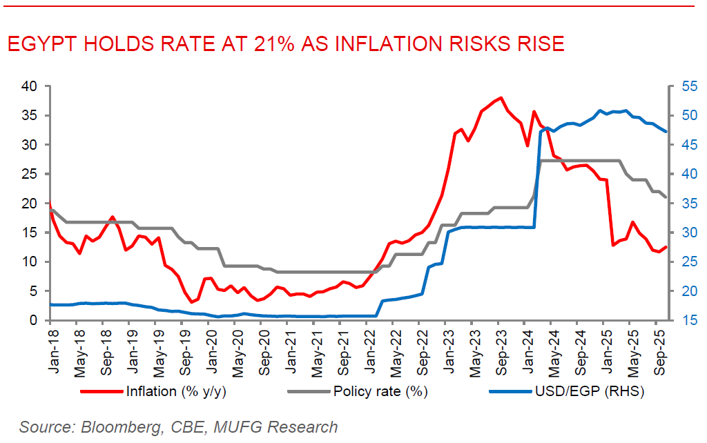 CBE Holds rate at 21% as inflation risks rise and policy turns more cautious. The Central Bank of Egypt (CBE) kept its policy rate unchanged at 21%, defying expectations of a cut, as it adopted a more cautious stance amid rising global and domestic inflation risks and slower easing cycles across major central banks. The CBE signalled a wait-and-see approach, emphasising the need for further improvement in underlying inflation, particularly stubborn services inflation, which has pushed monthly price pressures higher in September and October despite easing food prices. Economic activity remains solid, with GDP growth likely accelerating to 5.2% y/y in Q3 2025, driven by non-petroleum manufacturing, trade, and tourism, and the output gap moving closer to full capacity, which the CBE expected to reach by mid-2026. The sift in guidance implies no rate cuts this year, with easing expected to begin in Q1 2026, and brining rates to around 15%.