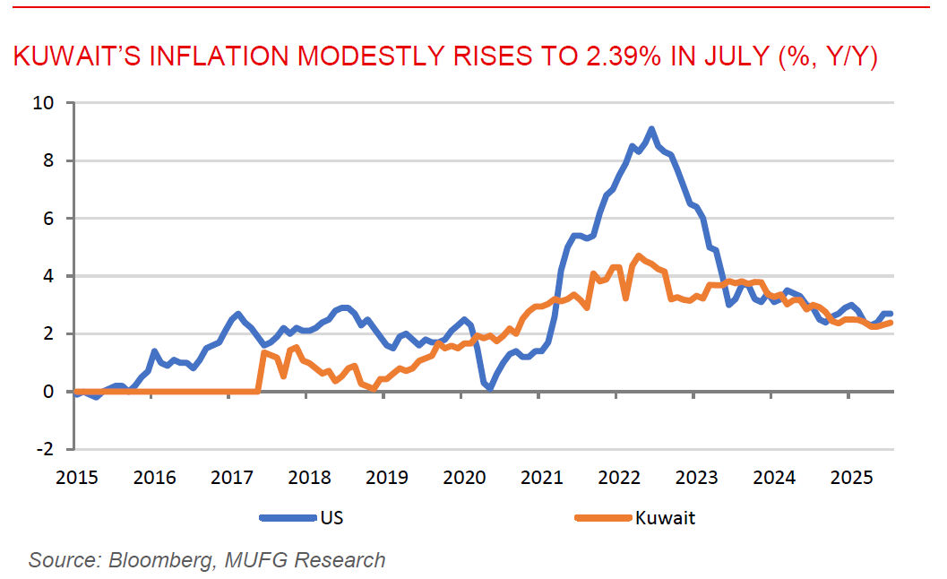 Kuwait’s inflation modestly rises to 2.39% in July. Inflation in Kuwait slightly went up from 2.32% y/y in June to 2.39% y/y to July. The increase was driven largely by the food and beverages category, which climbed approximately 5.11% y/y. Other notable contributors included miscellaneous goods and services, housing, and health services, while transportation costs declined by 1.81%. compare to broader averages, Kuwait’s inflation remains relatively moderate, tracking slightly below the IMF’s projected 2.5% for 2025. Kuwait is also accelerating economic transformation under Vision 2035, linking internal reforms with global partnerships to diversify growth. The government aims to reduce the budget burden, create over 50,000 jobs, and generate KWD1bn (USD3.25bn) in annual revenue by 2030, with international institutions projecting steady non-oil growth ahead.