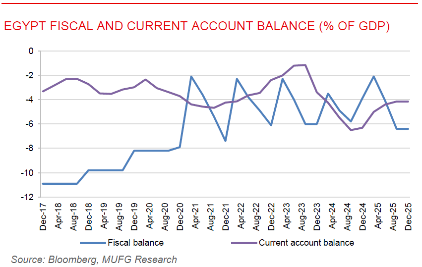 Egypt current account deficit narrows sharply on remittances and services boom. Egypt’s current account deficit narrowed by 45.2% to USD3.2bn in the Q3 of FY2025/26 from USD5.9bn a year earlier, supported by a surge in remittances and stronger services revenues, according to the Central Bank of Egypt (CBE). Net unrequited current transfers rose 28.4% to USD10.7bn, driven by a 29.8% increase in worker remittances to USD10.8bn, while the services surplus climbed 23.4% to USD5bn as tourism receipts rose to USD5.5bn and Suez Canal revenues increased to USD1.05bn. The non-oil trade deficit narrowed slightly to USD9.5bn on higher export proceeds, though gains were partly offset by a wider oil trade deficit of USD5.2bn due to higher energy imports. The capital and financial account swung to a net outflow of USD366 million, reflecting a rise in banks’ foreign assets, even as foreign direct investment posted a USD2.4bn net inflow and portfolio investment retuned to a USD1.8bn net inflow.