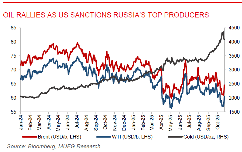 Oil rallies as US sanctions Russia’s top producers, escalating pressure. Oil prices surged after the US imposed sweeping sanctions on Russia’s two largest producers, Rosneft and Lukoil, intensifying pressure on Russia to end the war in Ukraine. Brent rose over 3% above USD64/b, while WTI near USD60/b, as US’s move is expected to cut Russian crude exports to India to near zero. The sanctions mark a major policy shift for President Trump, who had previously signalled willingness to negotiate with President Putin, but now cites Russia’s lack of commitment to peace. The decision contrast with earlier Western strategies like the G7 oil price cap that sought to curb Russian revenue without disrupting supply. Despite the rebound, Brent remains headed for a third consecutive monthly loss, as markets continue to weigh emerging signs of a global surplus. Going forward, geopolitical developments enforcement of these sanctions will be key in shaping oil flows and global price stability.