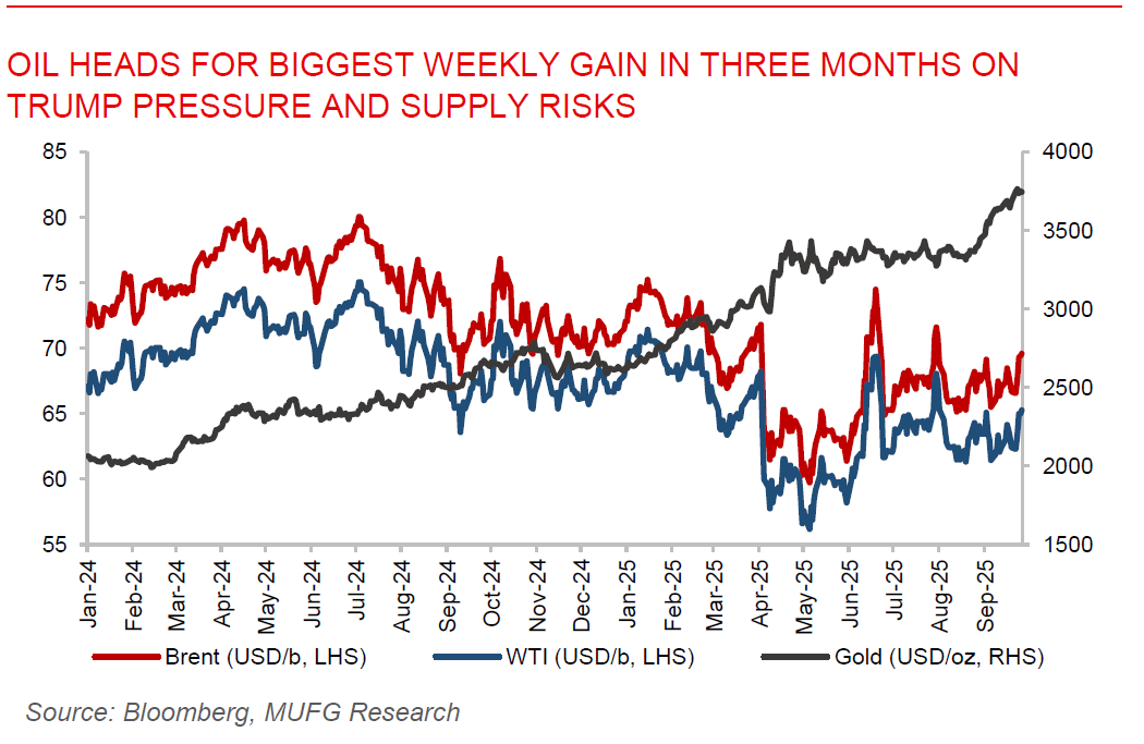 Oil heads for biggest weekly gain in three months on Trump pressure. Oil was on track for its strongest weekly advance since June, with Brent above USD69/b and WTI over USD65/b, as President Trump stepped up pressure on countries still buying Russian crude. Trump urged Turkish President Erdogan to halt purchases and discussed energy security with Hungary and Slovakia, while reiterating calls for NATO members to cut ties with Russia’s fuel. However, forecasts from the International Energy Agency continues to flag a surplus later this year. That outlook is reinforced by Iraq’s plan to resume Kurdistan oil exports through Turkey’s Ceyhan port this weekend, initially adding 230,000b/d and potentially ramping up to half a million barrels in the future. Despite the weekly jump, crude remains stuck In its narrow trading range as markets balance rising geopolitical tension against expectations of a looming glut.