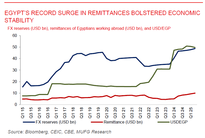 Egypt’s record surge in remittances bolstered economic stability. Egypt recorded a historic surge in remittances during FY 2024/2025, with inflows reaching USD36.5bn, a 66% increase compare to the previous year. The Central Bank of Egypt (CBE) highlighted that June alone saw an unprecedented USD3.6bn, marking the highest monthly inflow on record. This sharp rise underscores the resilience and confidence of Egyptians abroad in supporting the domestic economy, even amid ongoing financial challenges. Remittances remain a crucial source of foreign currency for Egypt, helping to bolster external reserves, ease pressure on the balance of payments, and stabilise the exchange rate. Going forward, sustaining this momentum will be essential in mitigating external vulnerabilities and providing a buffer for the country’s broader economic reform agenda.