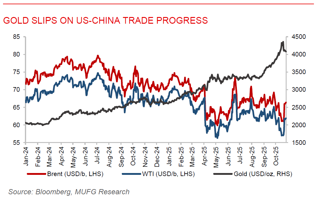 Gold slips as US-China trade progress eases haven demand. Gold retreated at the start of the week, falling as much as 1.3% toward USD4,058/oz, after posting its first weekly decline since mid-August. The pullback comes as signs of an imminent US-China trade deal reduced geopolitical and economic uncertainty, weakening demand for the safe-haven metal. The price reversal follows a rapid rally that pushed gold above USD4,380/oz last Monday, leaving it technically overbought. Still, gold remains up around 55% this year, supported by central-bank purchases and investor hedging against large fiscal deficits through the “debasement trade”. Attention now turns to a heavy central bank calendar, with rate decisions from the Fed, European Central Bank and Bank of Japan, where further monetary easing could provide renewed support for non-interest -bearing assets like gold.