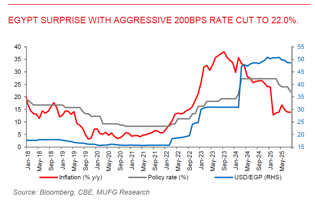 Egypt surprise with aggressive 200bps rate cut to 22.00%. Central Bank of Egypt (CBE) cut interest rates for the first time since May, reducing both the benchmark deposit rate and lending rate by 200bps to 22% and 23% respectively, as it seeks to revive investment and ease one of the region’s highest debt-serving burdens. The Monetary Policy Committee (MPC) justified the decision by pointing to a broad-based easing in price dynamics over the past two months and more favourable exchange rate developments, which it said created sufficient room for a “measured resumption of monetary easing.” Inflation is now projected by the CBE to average between 14% and 15% in 2025, providing space for further gradual cuts. Forward guidance emphasised a meeting-by-meeting approach, with the MPC committed to reassessing the scale and pace of future easing in line with incoming data and risk balance. Even after the latest move, the real policy rate stands at around 8ppts, which is considered sufficiently high to anchor disinflation and maintain support for the Egyptian pound, barring major global or geopolitical shocks.