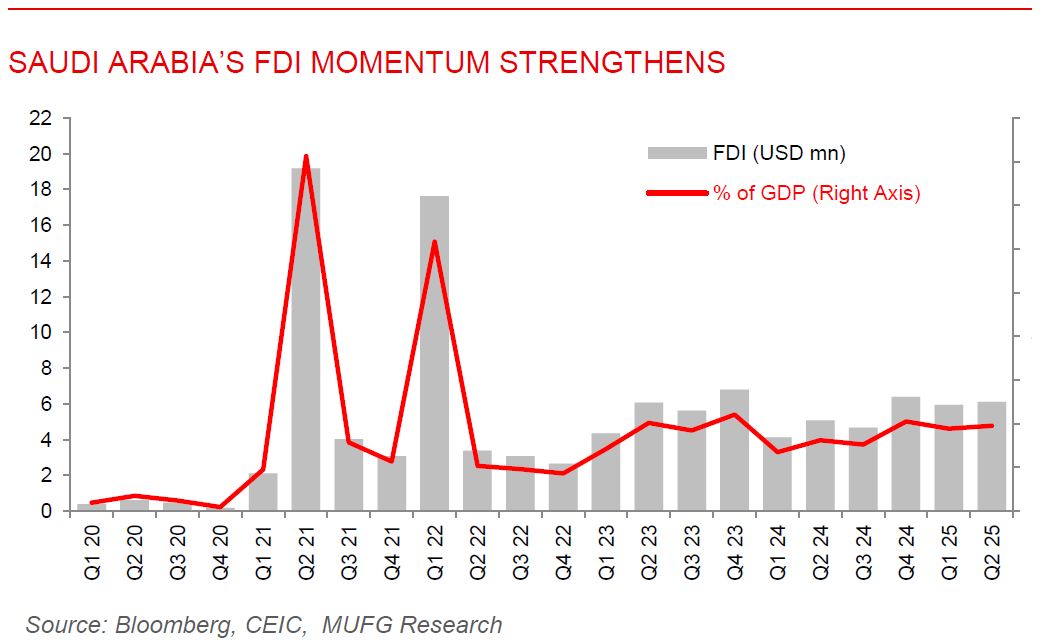 Saudi Arabia’s FDI momentum strengthens. Saudi Arabia recorded a strong 14.5% y/y rise in net foreign direct investment (FDI) inflows in Q2 2025, reaching SAR22.8bn (USD6.1bn), underscoring the Kingdom’s ability to attract capital despite regional and global economic uncertainties. The increase reflects growing investor confidence in Saudi’s pro-business reforms, ranging from easing regulatory barriers to broadening foreign ownership limits, alongside country’s drive to diversify under Vision 2030. Sectors such as financial services, tourism, logistics, and technology are drawing particular interest, supported by mega-projects and ongoing privatisation initiatives. While global FDI inflows remain volatile, Saudi’s consistent performance highlights its positioning as a key emerging market destination. Going forward, sustained policy reforms, clarity on regulatory framework, and the Kingdom’s continued push to open the capital markets will be critical in maintaining momentum and meeting its long-term diversification targets.