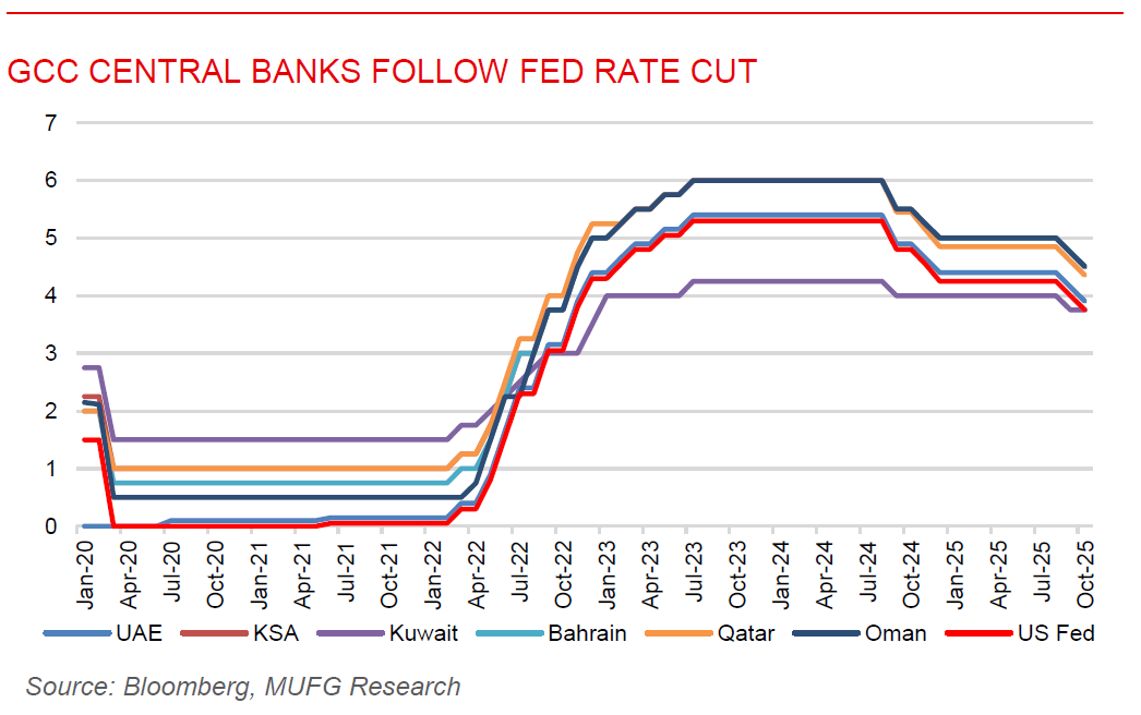 GCC central banks follow Fed rate cut to support monetary alignment. Following the US Fed’s 25bps rate cut, all GCC central banks, except Kuwait, moved in tandem to ease monetary policy in line with their dollar-pegged exchange rate frameworks. The Saudi Central Bank (SAMA) lowered its repo rate to 4.5% and the reverse repo rate to 4.0%, while the central Bank of the UAE reduced its base rate to 3.90% from 4.15%. Qatar’s central bank (QCB) trimmed its lending and repo rates by 25bps to 4.6% and 4.35% respectively. Both Oman and Bahrain followed suit, cutting their key rates to 4.5%. The coordinated policy easing reflects the GCC’s continued effort to maintain exchange rate stability, support liquidity, and ensure monetary conditions remain conducive to sustained economic growth amid global shifts in interest rate trajectory.