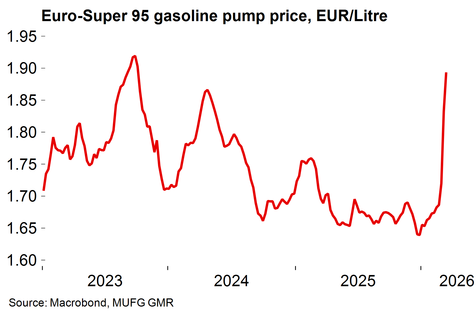 Our central scenario is still that the ECB remains on hold this year with less scope for second-round effects than in 2022. But, like most observers, we have less conviction around the scope for swift de-escalation in the Middle East and are bracing for prolonged energy supply disruption. Higher oil prices will mechanically and quickly lift inflation rates. Pump prices have risen sharply and will add ~25bp onto headline inflation, pointing to a moderate overshoot ahead – euro area inflation could now approach 2.5% over coming months. That will make many officials uncomfortable.